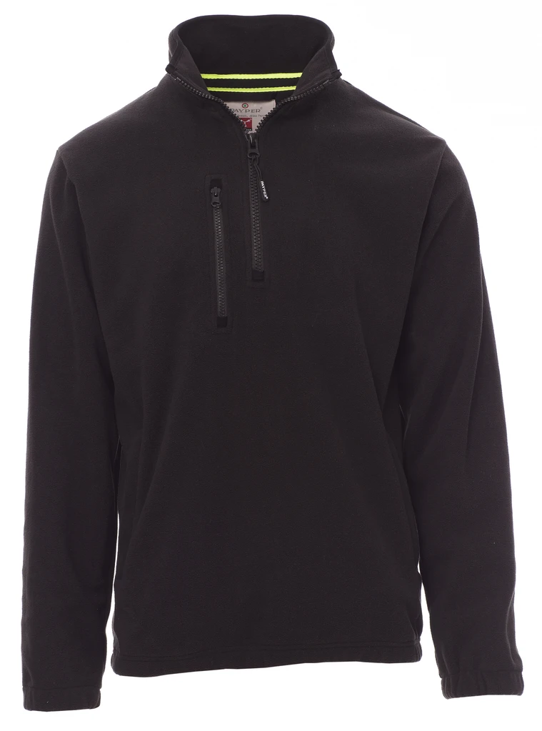 Do 1/2 délky černý plastový zip 8 mm široký, raglánové rukávy, elastické manžety a pas, 2 kapsy se skrytým zipem, 1 přední kapsa na hrudi, za krkem výztužná páska v kontrastní barvě, vyztužené švy