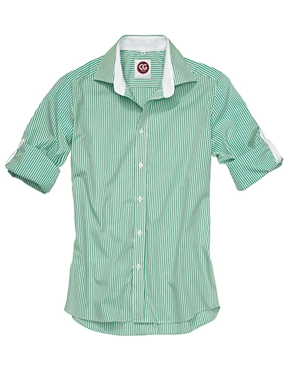 Košile s proužky v barvě příze, stálobarevná, z nežehlivé směsové tkaniny, rukávy lze vyhrnout a zafixovat bílou patkou, bílý vnitřní límec, lze prát na 60°C, vhodné pro průmyslové praní.