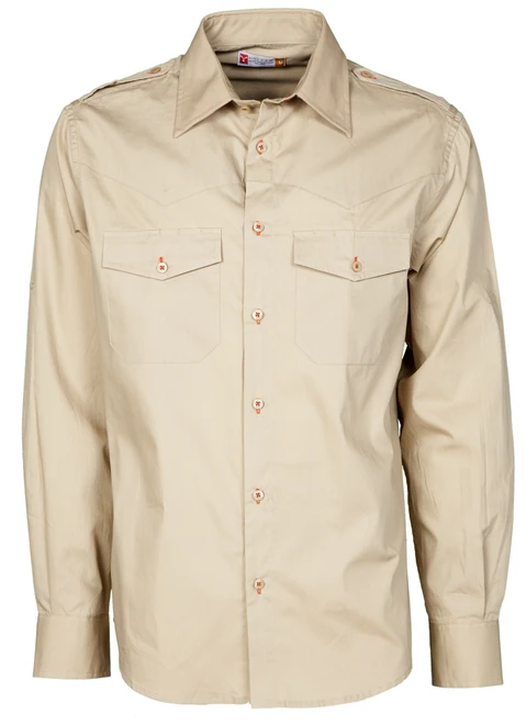 Mírně zeštíhlená, italský límeček, manžety s 2 knoflíky a knoflíkovou dírkou, oboustranně prošitá léga s barevně sladěnými knoflíky a červenými knoflíkovými dírkami (kromě bílého provedení), tvarované sedlo vpředu (kromě bílého provedení), nárameníky, dvě náprsní kapsy s klopou, vyhrnovací rukávy s knoflíkem a poutkem