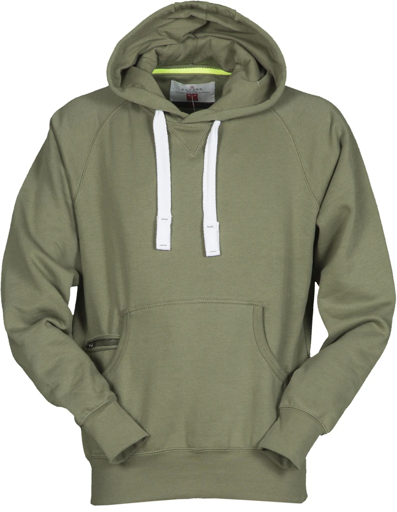 Dvojité švy, kapuce, kovová očka na kapuci, bílá stahovací šňůrka, raglánové rukávy, dekorativní prošití do "V" pod výstřihem, klokaní kapsa, malá kapsa na zip, elastické manžety a spodní lem, vyztužené švy