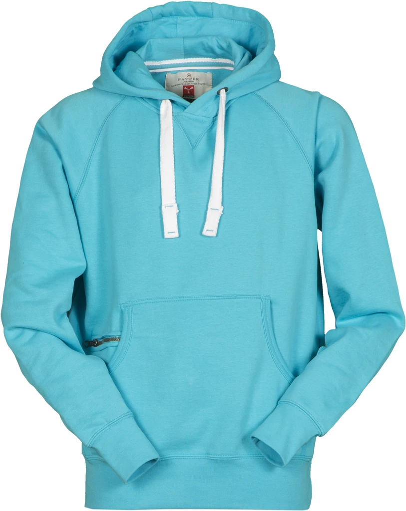 Dvojité švy, kapuce, kovová očka na kapuci, bílá stahovací šňůrka, raglánové rukávy, dekorativní prošití do "V" pod výstřihem, klokaní kapsa, malá kapsa na zip, elastické manžety a spodní lem, vyztužené švy