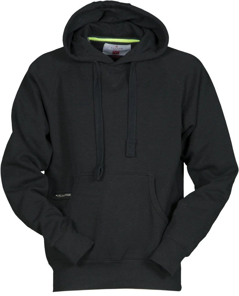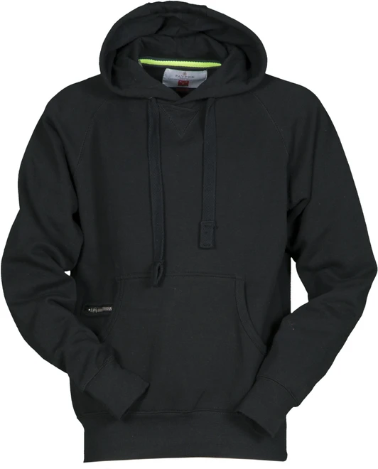 Dvojité švy, kapuce, kovová očka na kapuci, bílá stahovací šňůrka, raglánové rukávy, dekorativní prošití do "V" pod výstřihem, klokaní kapsa, malá kapsa na zip, elastické manžety a spodní lem, vyztužené švy