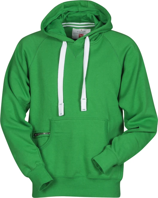 Dvojité švy, kapuce, kovová očka na kapuci, bílá stahovací šňůrka, raglánové rukávy, dekorativní prošití do "V" pod výstřihem, klokaní kapsa, malá kapsa na zip, elastické manžety a spodní lem, vyztužené švy