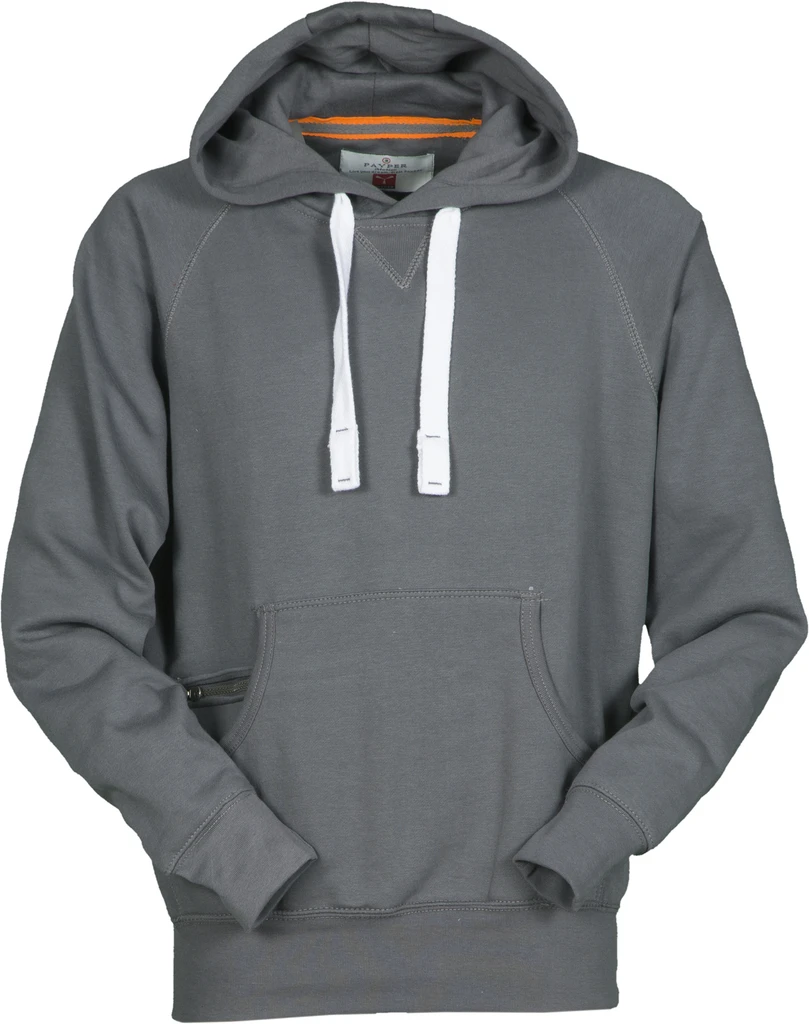 Dvojité švy, kapuce, kovová očka na kapuci, bílá stahovací šňůrka, raglánové rukávy, dekorativní prošití do "V" pod výstřihem, klokaní kapsa, malá kapsa na zip, elastické manžety a spodní lem, vyztužené švy