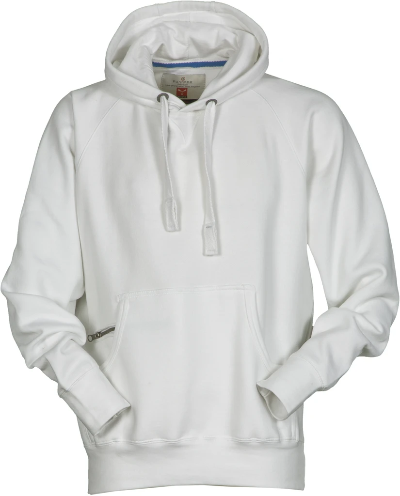 Dvojité švy, kapuce, kovová očka na kapuci, bílá stahovací šňůrka, raglánové rukávy, dekorativní prošití do "V" pod výstřihem, klokaní kapsa, malá kapsa na zip, elastické manžety a spodní lem, vyztužené švy