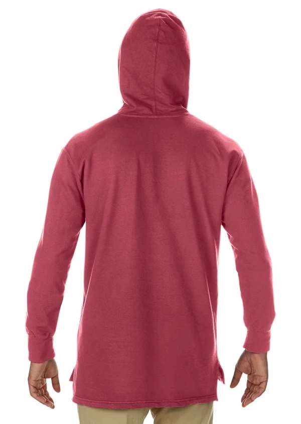 Předepraná a jednotlivě barvená tkanina (garment dye), "Scuba" kapuce s barevně ladícími šňůrkami, páska za krkem (twill), žebrované manžety, klokaní kapsa, snížený pas, postranní rozparky, dvojité prošití spodního lemu.