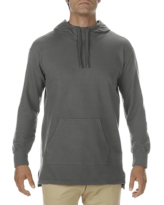 Předepraná a jednotlivě barvená tkanina (garment dye), "Scuba" kapuce s barevně ladícími šňůrkami, páska za krkem (twill), žebrované manžety, klokaní kapsa, snížený pas, postranní rozparky, dvojité prošití spodního lemu.
