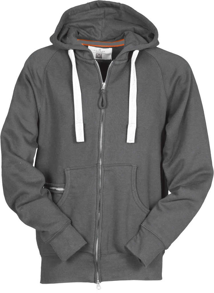 Zip po celé délce, kovový dvojcestný jezdec, kapuce s dvojitým prošitím švů, bílá stahovací šňůrka, kovová očka na kapuci, raglánové rukávy, klokaní kapsa, malá kapsa na zip, elastické manžety a spodní lem, vyztužené švy