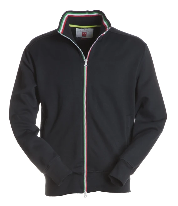 Plastový zip po celé délce - v barvách italské vlajky, dvojitý jezdec, žebrovaný límec s kontrastním proužkem, vsazené rukávy, 2 kapsy, elastické manžety a spodní lem, vyztužené švy