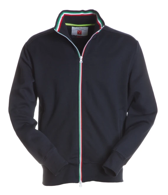 Plastový zip po celé délce - v barvách italské vlajky, dvojitý jezdec, žebrovaný límec s kontrastním proužkem, vsazené rukávy, 2 kapsy, elastické manžety a spodní lem, vyztužené švy