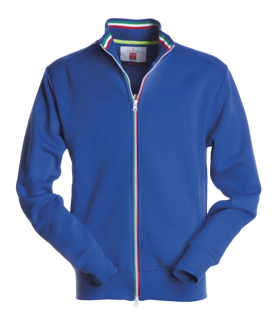 Plastový zip po celé délce - v barvách italské vlajky, dvojitý jezdec, žebrovaný límec s kontrastním proužkem, vsazené rukávy, 2 kapsy, elastické manžety a spodní lem, vyztužené švy