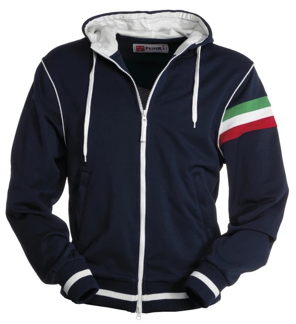 Plastový zip po celé délce, dvojitý kovový jezdec, kontrastní kapuce se stahovací šňůrkou, kontrastní proužek na manžetách a spodním lemu, na levém rukávu pruhy v barvách italské vlajky, 2 kapsy na zip, vyztužené švy