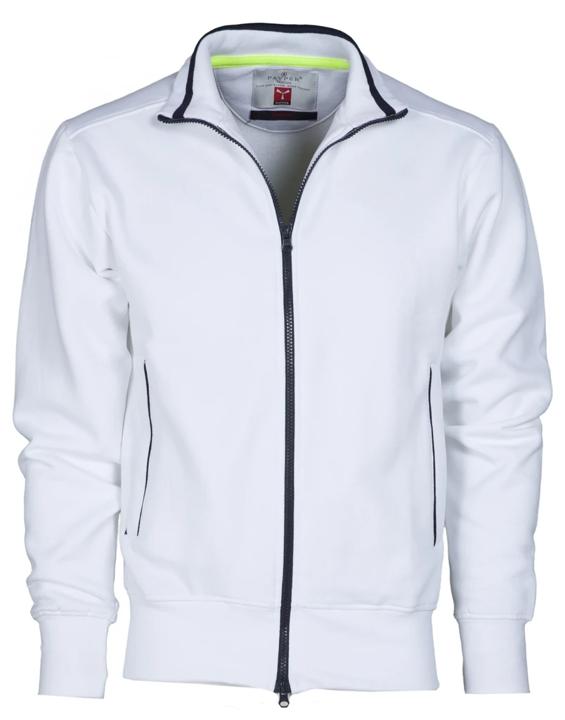 Plastový kontrastní zip po celé délce, dvojcestný kovový jezdec, kontrastní zip na žebrovaném límci a kapsách na zip, vsazené rukávy, vyztužené švy, elastické manžety a spodní lem