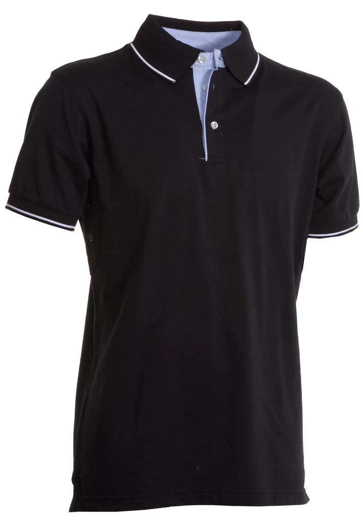 Krátký rukáv, zapínání na 3 bílé knoflíky, vnitřní límeček, rozparky a léga v barvě Oxford blue, žebrování na límci a na manžetách, kontrastní proužek na límci a manžetách, pod podpažím 2 větrací otvory, boční rozparky s vyztuženými švy, elastické švy, výztužná páska za krkem