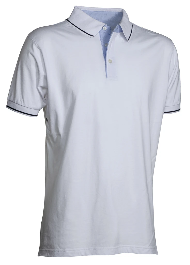 Krátký rukáv, zapínání na 3 bílé knoflíky, vnitřní límeček, rozparky a léga v barvě Oxford blue, žebrování na límci a na manžetách, kontrastní proužek na límci a manžetách, pod podpažím 2 větrací otvory, boční rozparky s vyztuženými švy, elastické švy, výztužná páska za krkem