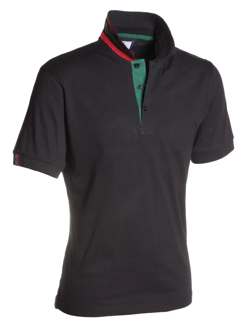 Krátký rukáv, zapínání na 3 knoflíčky (tón v tónu), na límci kontrastní pruh, vnitřní knoflíková léga a boční rozparky v kontrastní barvě, na pravém rukávu svislý úzký proužek v kontrastní barvě, žebrované manžety, výztužná páska za krkem