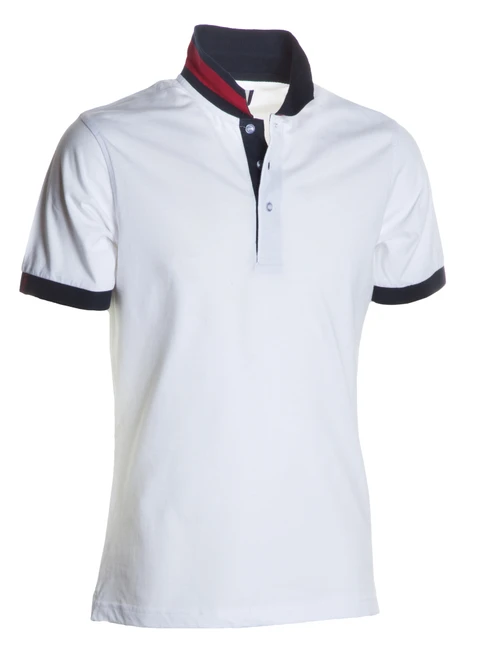 Krátký rukáv, zapínání na 3 knoflíčky (tón v tónu), na límci kontrastní pruh, vnitřní knoflíková léga a boční rozparky v kontrastní barvě, na pravém rukávu svislý úzký proužek v kontrastní barvě, žebrované manžety, výztužná páska za krkem