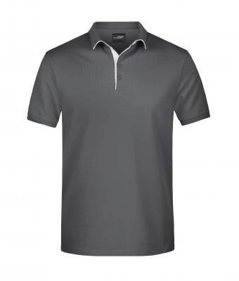 Kvalitní piké, pletený límec a manžety rukávů, kontrastní pruhy na límci, léga v kontrastní barvě, knoflíčky tón v tónu, boční rozparky, zapínání na 3 knoflíčky.