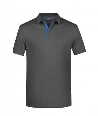 Kvalitní piké, pletený límec a manžety rukávů, kontrastní pruhy na límci a manžetách, léga v kontrastní barvě, knoflíčky tón v tónu, boční rozparky, zapínání na 3 knoflíčky.