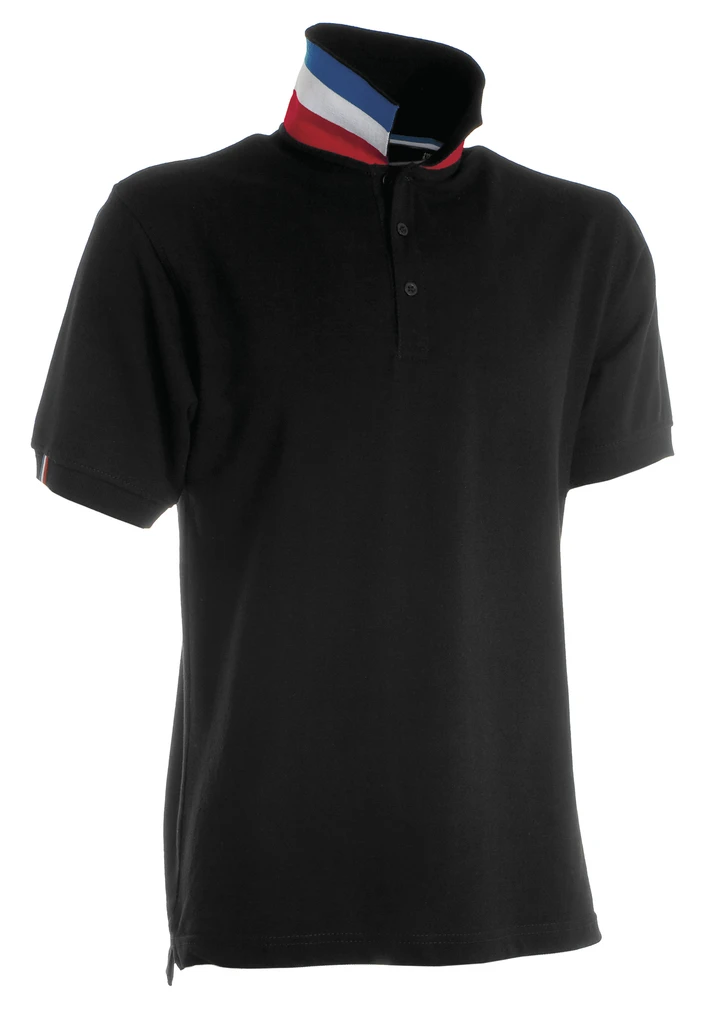 Krátký rukáv, léga s 3 ladícími knoflíky, na rubové straně límce motiv vlajky, na pravém rukávu proužky ve stejné barvě jako vlajka, žebrování na límci a manžetách, výztužná páska za krkem v barvě vlajky, vyztužené boční švy