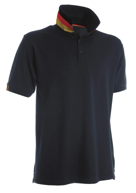 Krátký rukáv, léga s 3 ladícími knoflíky, na rubové straně límce motiv vlajky, na pravém rukávu proužky ve stejné barvě jako vlajka, žebrování na límci a manžetách, výztužná páska za krkem v barvě vlajky, vyztužené boční švy
