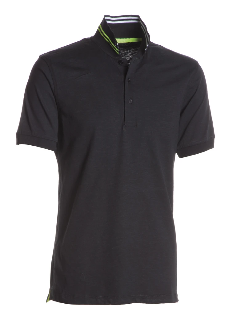 Krátký rukáv, zapínání na 3 knoflíčky - ve stejné barvě jako polokošile, límeček s kontrastními pruhy, na límečku a manžetách žebrované lemy, výztužná páska za krkem v kontrastní barvě, boční rozparky