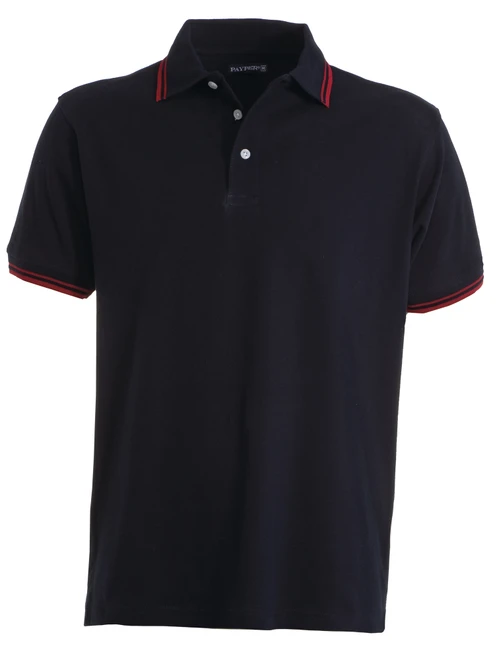 Krátký rukáv, zapínání na 3 bílé knoflíky, žebrování na límci a manžetách, kontrastní proužek na límci a manžetách, boční rozparky s vyztuženými švy, elastické švy, výztužná páska za krkem
