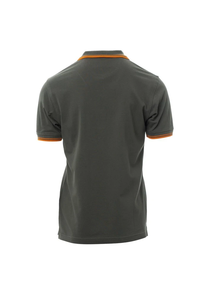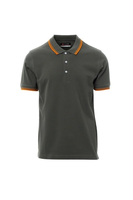 Krátký rukáv, zapínání na 3 bílé knoflíky, žebrování na límci a manžetách, kontrastní proužek na límci a manžetách, boční rozparky s vyztuženými švy, elastické švy, výztužná páska za krkem