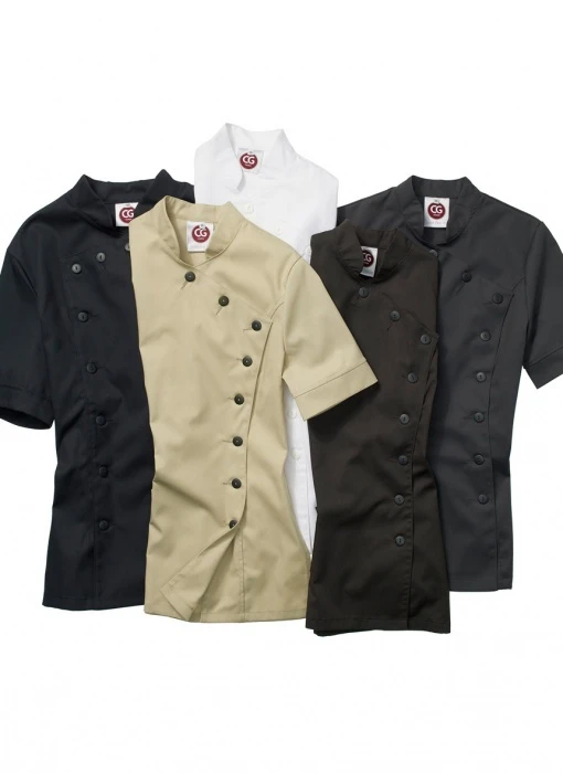 Krátký rukáv, stojáček, šikmá klopa s knoflíky, boční kapsa, zadní rozparek pro snadný pohyb, jednoduchá údržba, lze prát na 95°C, stálobarevný a pohodlný materiál.