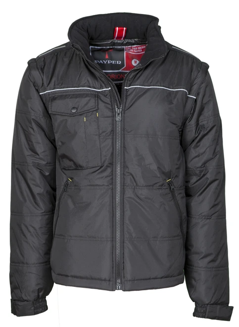 Plastový zip po celé délce, 2 vnější prostorné kapsy na zip, prostorná kapsa na hrudi na mobilní telefon, vnitřní kapsa, reflexní lemování na ramenou a hrudi, vatová vycpávka, podšívka na límci z microfleecu