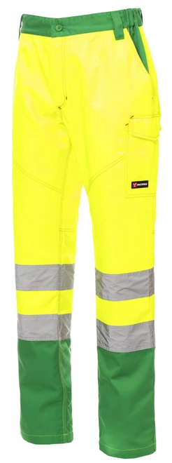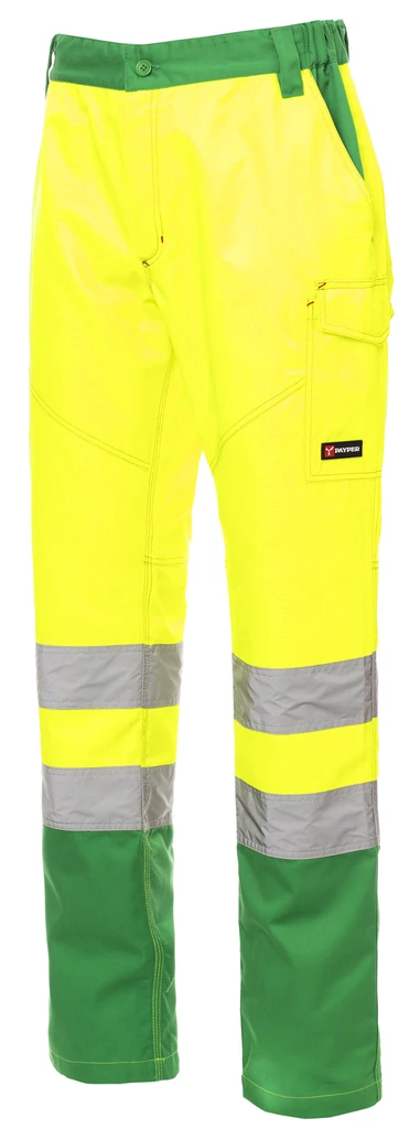 Vysoká viditelnost, vhodné pro všechna roční období, reflexní pruhy, elastické boky, poutka na pásek, zapínání na zip a knoflík, 2 přední kapsy, boční kapsa, kapsa na metr, 2 zadní kapsy (1 otevřená, 1 s klopou na suchý zip), kontrastní prošití, trojité švy v rozkroku a na vnitřní nohavici