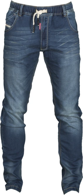 5 kapes, elastický pas se stahovací šňůrkou, poutka na pásek, zapínání na kovový zip, nošený vybledlý vzhled, kontrastní švy, dvojité švy na vnitřní straně nohavic, zúžené nohavice