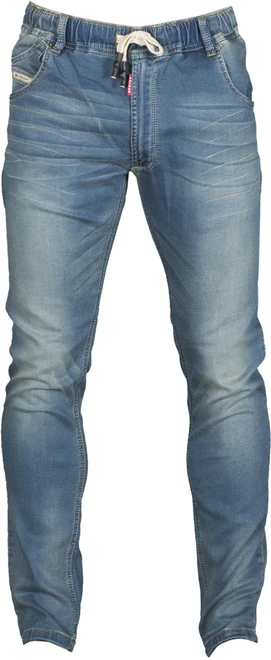 5 kapes, elastický pas se stahovací šňůrkou, poutka na pásek, zapínání na kovový zip, nošený vybledlý vzhled, kontrastní švy, dvojité švy na vnitřní straně nohavic, zúžené nohavice