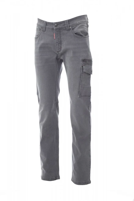 5 kapes, 2 velké vyztužené kapsy na bocích se zamykacím systémem, 1 boční kapsa na zip, 1 kapsa na mobilní telefon, držák na kladivo, držák na pero, zapínání na kovový zip a knoflík, poutka na pásek v pase, nošený vybledlý vzhled, kontrastní švy, trojité švy na vnitřní straně nohavic, rovný střih
