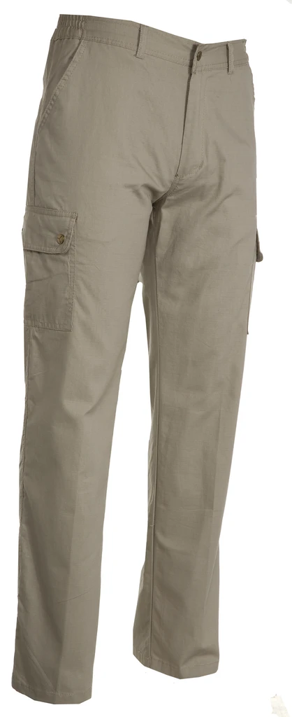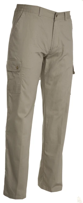 Letní kalhoty, elastické řasení na bocích, poutka na pásek, zapínání na zip a knoflík, 2 přední kapsy, 2 boční kapsy s klopou, na levé nohavici kapsa na zip, 2 zadní kapsy na knoflík