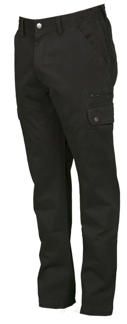 Vhodné na všechny roční období, elastické řasení na bocích, poutka na pásek, zapínání na zip a knoflík, 2 přední kapsy, 2 boční kapsy s klopou, na levé nohavici kapsa na zip, 2 zadní kapsy na knoflík