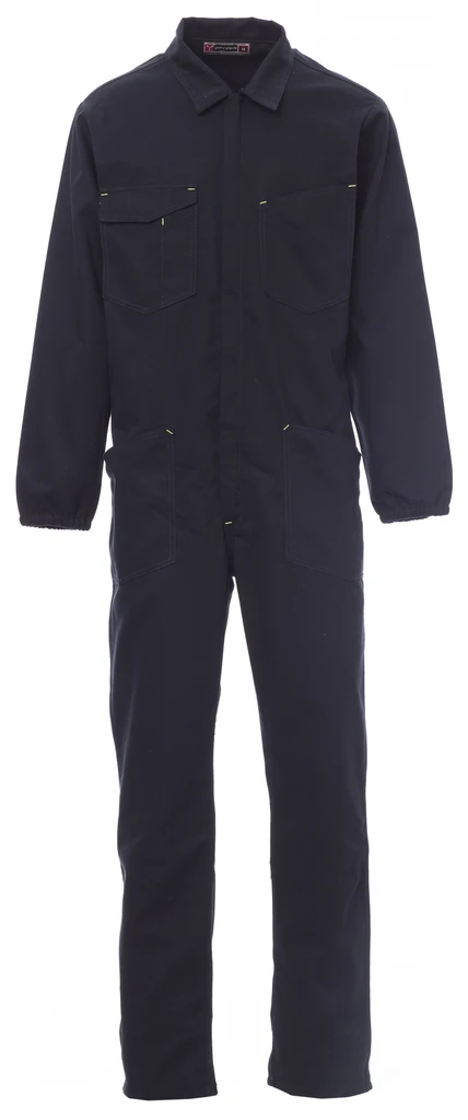 Centrální zip s dvojitým kovovým jezdcem, elastické manžety, elastický pas, 2 přední boční kapsy, 2 náprsní kapsy (jedna s klopou na suchý zip), držák na mobilní telefon, držák na pero, držák na metr, dvojité švy v rozkroku a na vnitřní nohavici