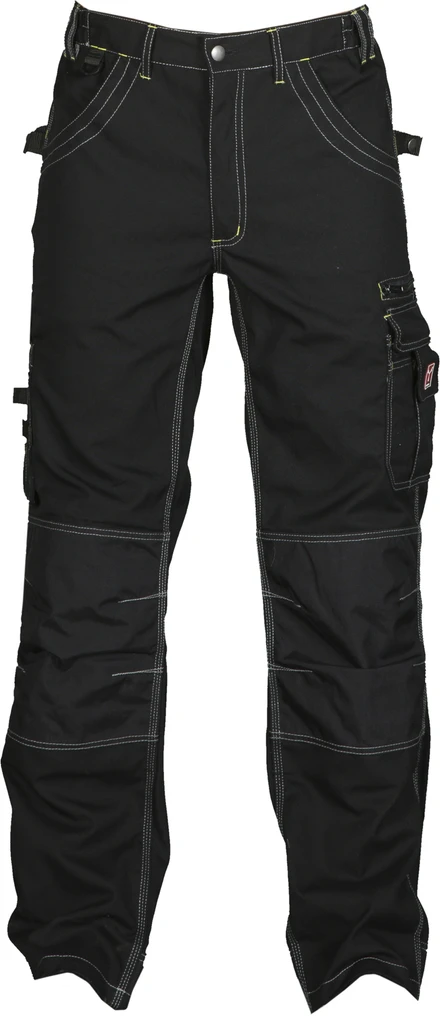 Zesílená kolena, poutka na pásek, elastické boky, zapínání na zip a kovový knoflík, 2 přední kapsy, 2 boční multifunkční kapsy s odnímatelným držákem na jmenovku, kapsa na zip, 2 zadní kapsy, držák na kladivo, kontrastní panely a švy, trojité švy na vnitřních i vnějších nohavicích