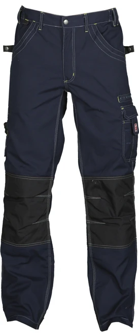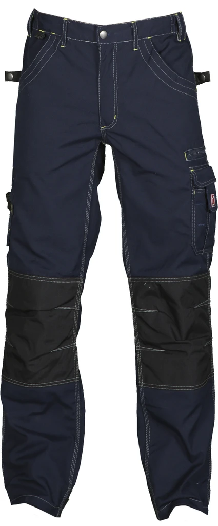 Zesílená kolena, poutka na pásek, elastické boky, zapínání na zip a kovový knoflík, 2 přední kapsy, 2 boční multifunkční kapsy s odnímatelným držákem na jmenovku, kapsa na zip, 2 zadní kapsy, držák na kladivo, kontrastní panely a švy, trojité švy na vnitřních i vnějších nohavicích