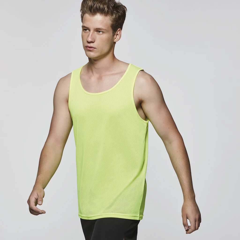 Široká ramínka z mikroperforované tkaniny, lemování u krku a na průramcích ze stejného materiálu, prodyšný materiál příjemný na dotek, doporučený branding: transfer, vinyl a sublimace, odstranitelná cedulka, prodyšný materiál, funkční materiál.