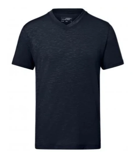 Funkční materiál vhodný pro volný čas a sport, prodyšný rychleschnoucí a vlhkost regulující materiál, elastický jednoduchý úplet, výztužná páska za krkem, výstřih do "V".