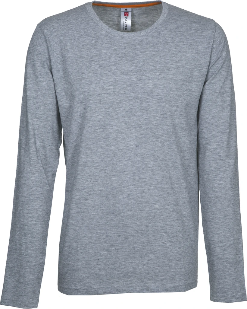 Dlouhý rukáv, kulatý výstřih, 15 mm široký lem okolo výstřihu s příměsí spandexu, kontrastní vnitřní výztužná páska za krkem, elastické švy, boční švy