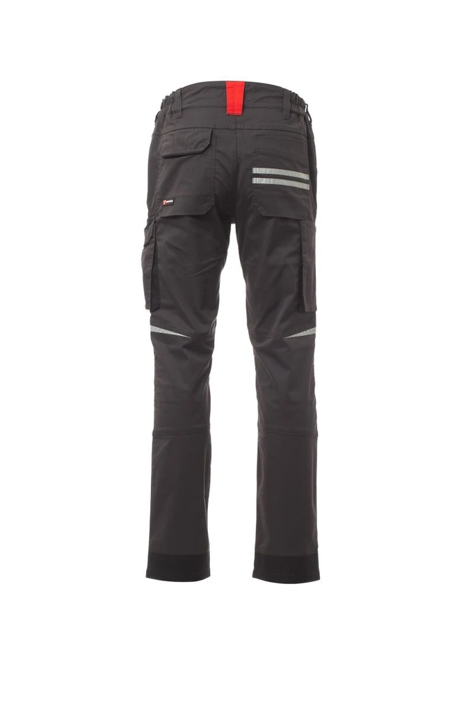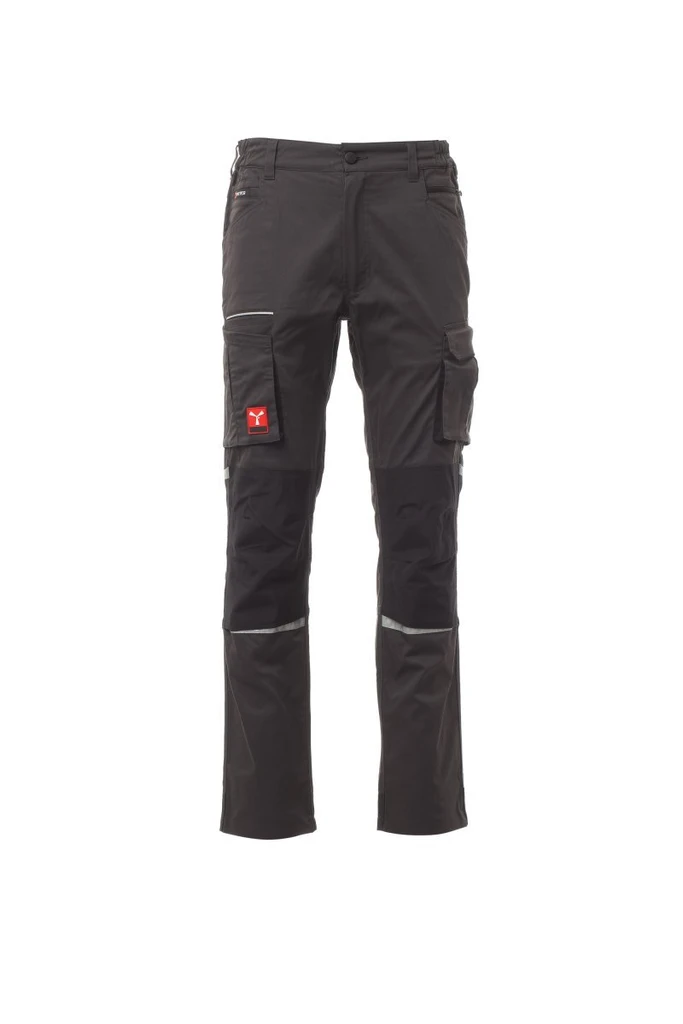 Unisexové kalhoty, stretch, celoroční, gumičky na bocích a poutka na pásek v pase, zapínání na zip a přizpůsobený knoflík. Na přední straně kalhoty mají dvě tvarované kapsy, na pravé straně kapsičku na mince a na levé straně bezpečnostní kapsičku na zip. Na přední straně levé nohavice je kapsa s klínkem, klopa na suchý zip a pouzdro na jmenovku. Na přední straně pravé nohavice je kapsička na telefon s reflexním lemem a kapsička s klínkem. Obě nohavice mají připevnění pro chrániče kolen z Nylon Oxford 500D, z kontrastní látky (s rozepínáním zezdola) a reflexní pásky, které signalizují rozepnutí. Na zadní straně je kapsa s malou klopou na suchý zip a kapsa bez klopy se 2 reflexními páskami, kapsička na svinovací metr (pravá nohavice), reflexní vložky ve výšce kolen (obě nohavice), patní chrániče z kontrastní látky (obě nohavice). Dále jsou přítomny: - prošívání trojjehlou v rozkroku, na vnitřní a vnější straně nohavic - kontrastní výztuže na různých místech. Italské prostřední velikosti 48-50-52 mají běžnou vnitřní délku nohavic 82 cm.