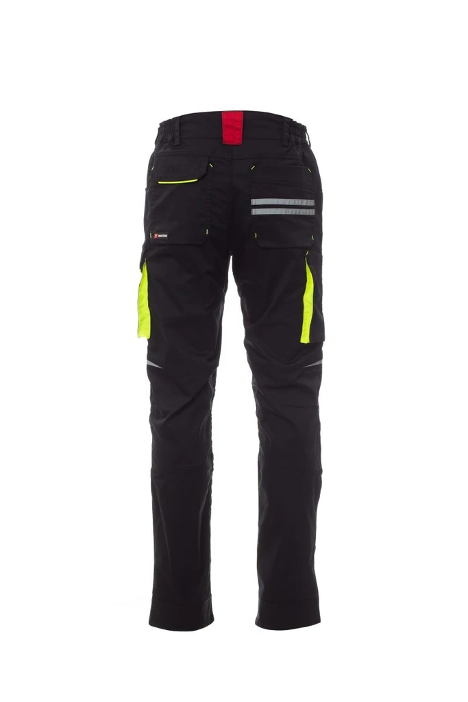 Unisexové kalhoty, stretch, celoroční, gumičky na bocích a poutka na pásek v pase, zapínání na zip a přizpůsobený knoflík. Na přední straně kalhoty mají dvě tvarované kapsy, na pravé straně kapsičku na mince a na levé straně bezpečnostní kapsičku na zip. Na přední straně levé nohavice je kapsa s klínkem, klopa na suchý zip a pouzdro na jmenovku. Na přední straně pravé nohavice je kapsička na telefon s reflexním lemem a kapsička s klínkem. Obě nohavice mají připevnění pro chrániče kolen z Nylon Oxford 500D, z kontrastní látky (s rozepínáním zezdola) a reflexní pásky, které signalizují rozepnutí. Na zadní straně je kapsa s malou klopou na suchý zip a kapsa bez klopy se 2 reflexními páskami, kapsička na svinovací metr (pravá nohavice), reflexní vložky ve výšce kolen (obě nohavice), patní chrániče z kontrastní látky (obě nohavice). Dále jsou přítomny: - prošívání trojjehlou v rozkroku, na vnitřní a vnější straně nohavic - kontrastní výztuže na různých místech. Italské prostřední velikosti 48-50-52 mají běžnou vnitřní délku nohavic 82 cm.