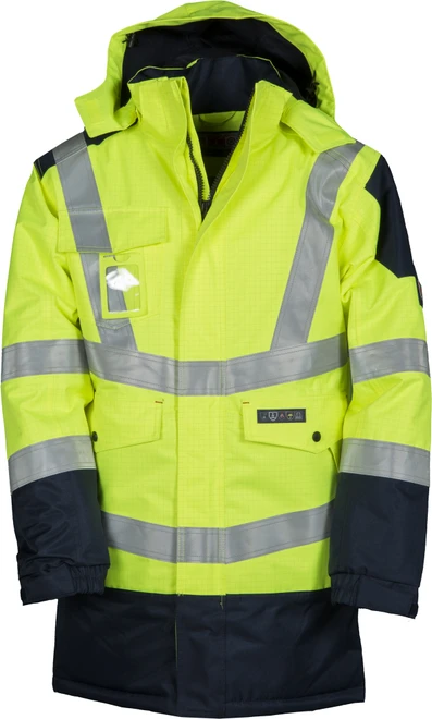 Vysoká viditelnost, ve dvou tónech, reflexní pruhy, 8 mm široký plastový zip, kovový jezdec, odnímatelná přesně padnoucí kapuce se stahovací šňůrkou, prostorné přední kapsy na klopu s cvokem, 2 kapsy na zip, odnímatelný držák na jmenovku, polstrovaná