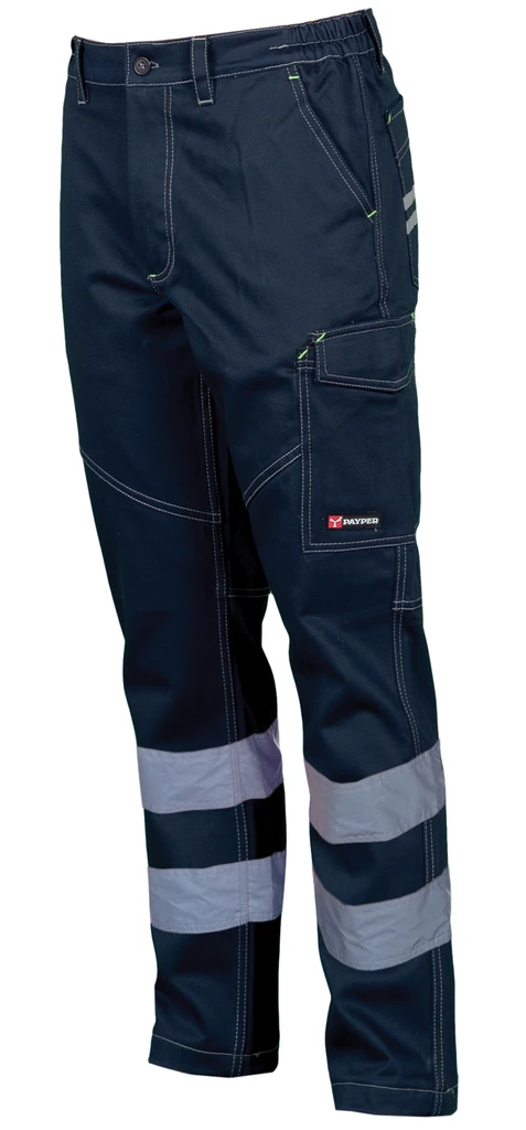 Unisex střih, zapínání na zip a plastový knoflík, poutka na pásek, elastické boky, 2 klasické přední kapsy, 1 boční kapsa se speciálním zavíracím systémem, 2 zadní kapsy (1 s klopou na suchý zip), trojité švy, kontrastní vsadky a švy, reflexní pásky na nohavicích, reflexní pásky na zadní kapse