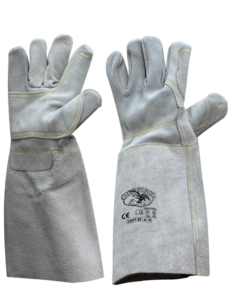 Oblasti použití: vhodné k manipulaci s rozpáleným materiálem; Vyztužená dlaň, palec a ukazováček, ochrana zápěstí, 20 cm široká manžeta z dělené kůže, bytelné, velmi odolné, ochranné, pevné uchopení