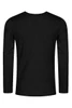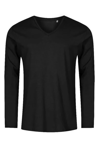Jednožerzejové triko s dlouhým rukávem, výstřihem do V a límečkem z vlastní tkaniny je vyrobená z česané bavlny. Zvláště hladký povrch a splývavá látka dodávají triku jedinečný, elastický a hedvábný povrch. Tričko má úzký střih a je vyrobené s bočními švy. Certifikováno podle OEKO-TEX®