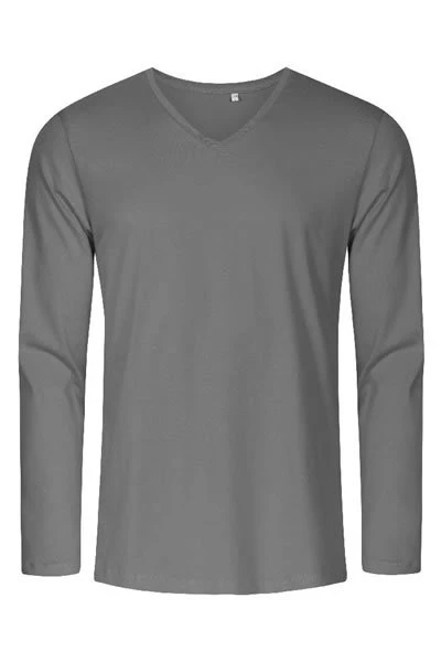 Jednožerzejové triko s dlouhým rukávem, výstřihem do V a límečkem z vlastní tkaniny je vyrobená z česané bavlny. Zvláště hladký povrch a splývavá látka dodávají triku jedinečný, elastický a hedvábný povrch. Tričko má úzký střih a je vyrobené s bočními švy. Certifikováno podle OEKO-TEX®