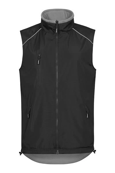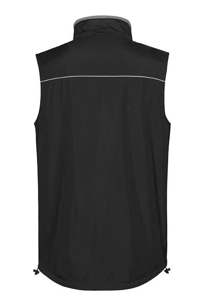 Oboustranná vesta s napoleonovou kapsou na přední straně disponuje dvěmi bočními kapsami na zip. Vesta má našitý kroužek na klíče v boční kapse, reflexní lemování a tahače zipů. Vesta je vybavená tunýlkovou stahovací šňůrkou na lemu se stopkami, zahnutým lemem a neviditelným zipem na ozdobu. Má moderní střih.